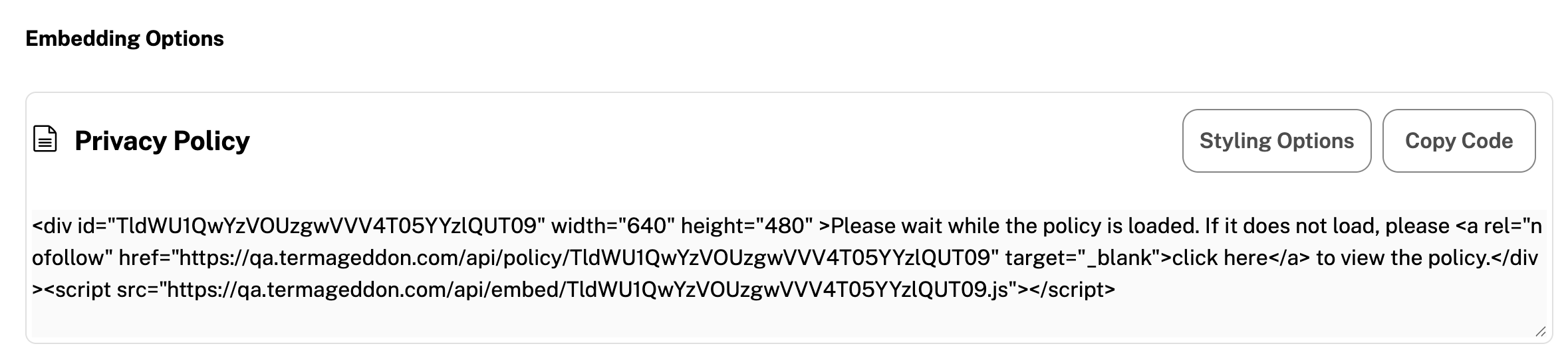 11. Grab your Termageddon embed code - To view your embed codes, log into Termageddon in another browser tab (or another browser window), click into your license, and click Embed Codes on the left hand side. Click the Style Options button to view/enable styling features (additional styling can be performed with CSS after you embed the codes -see css guide). When ready, click the Copy button.