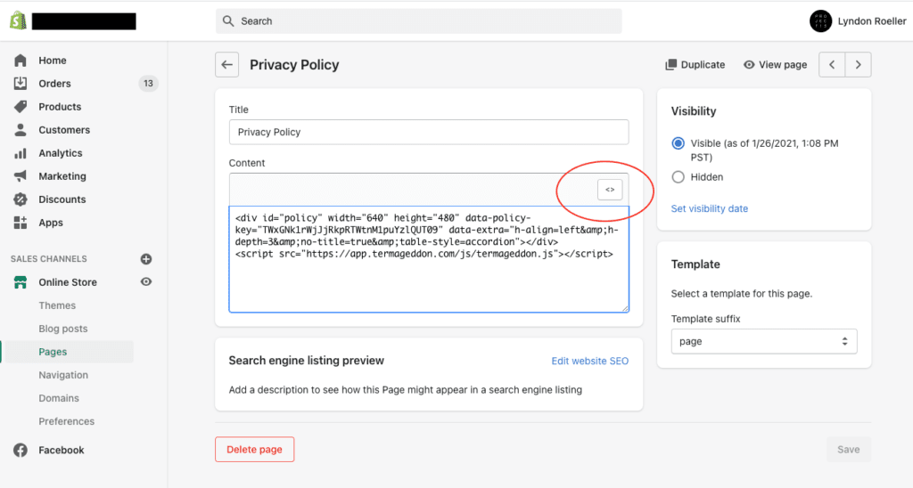 Using Termageddon with a Shopify website is easy, but there is something to note before we begin. Shopify provides a built-in area for "legal policies". Although Shopify doesn't support embed codes directly with these fields, there’s a simple work-around that will allow you to display your Termageddon policies. These instructions show how to address this.