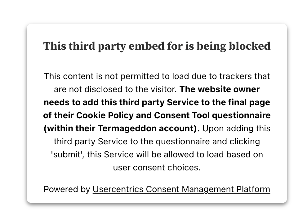 This content is not permitted to load due to trackers that are not disclosed to the visitor. The website owner needs to add this third party Service to the final page of their Cookie Policy and Consent Tool questionnaire (within their Termageddon account). Upon adding this third party Service to the questionnaire and clicking 'submit', this Service will be allowed to load based on user consent choices.