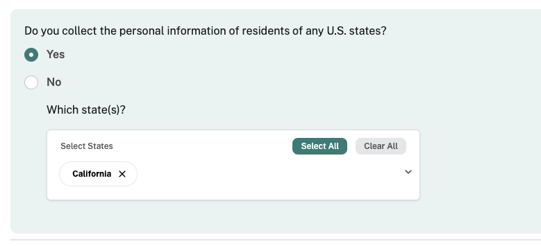 If you include California in your answer to the above question, you will be provided the option to create a consent banner for CIPA coverage in Privacy Policy remaining questions (unless you answer 'yes' to any of the opt out questions listed below).