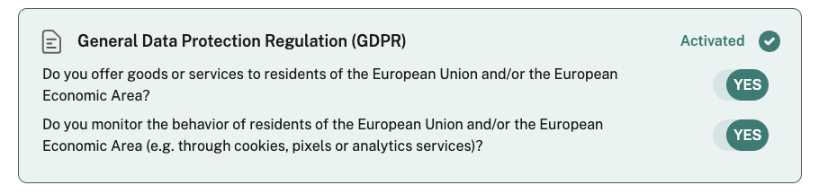 If you answer "yes" to EITHER ONE of these questions, GDPR will apply and the Cookie Policy and Consent Tool will be available for activation on page 3 of the Privacy Policy questionnaire.
