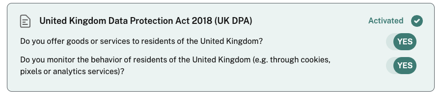 If you answer "yes" to EITHER ONE of these questions, UK DPA will apply and the Cookie Policy and Consent Tool will be available for activation on page 3 of the Privacy Policy questionnaire.