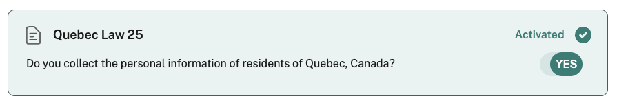 Please note that when you answer the Privacy Law Identifier questions in such a way that the privacy law applies to you, you will see that the law states "Activated". If you answer the questions in such a way that the privacy laws do not apply to you, the law will state "Inactive".