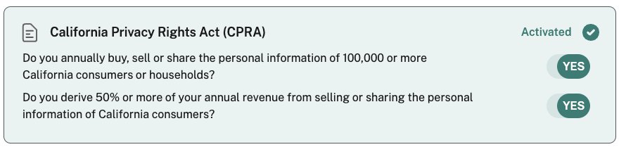 If you generate over $25 million per year in revenue, or you answer "Yes" to any of the questions in the above screenshot, then you will be provided an Opt out consent banner for CPRA coverage.