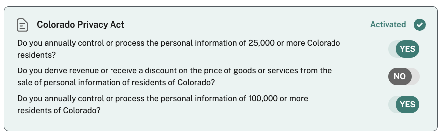 If you you answer "Yes" to any of the questions in the above screenshot, then you will be provided an Opt out consent banner for Colorado Privacy Act coverage.
