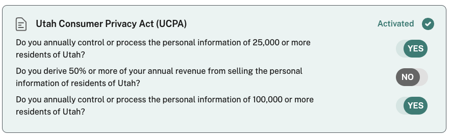 If you generate over $25 million per year in revenue, and you answer "Yes" to the questions in the above screenshot, then you will be provided an Opt out consent banner for UCPA coverage.