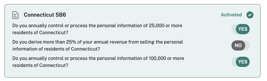 If you answer "Yes" to any of the questions in the above screenshot, then you will be provided an Opt out consent banner for Connecticut SB6 coverage.