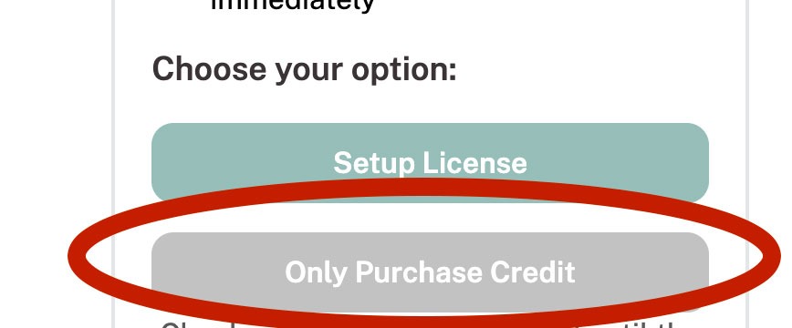 3. Click 'buy license'. You will then follow the steps to add your payment information and purchase a single license subscription. Be sure to select "Only purchase credit" (this is what allows Termageddon to migrate the license from the previous owner's account into the new account and assign it to your new subscription).