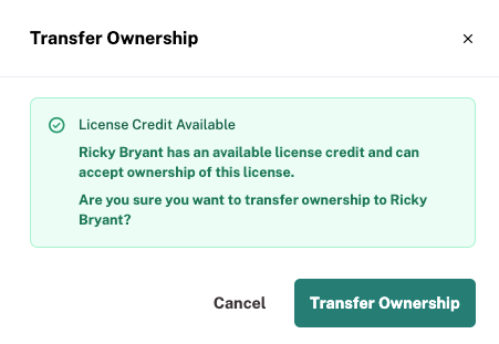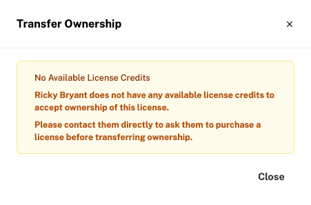 Note: If the new owner has not yet purchased a license credit, you will instead see this message in the popup: